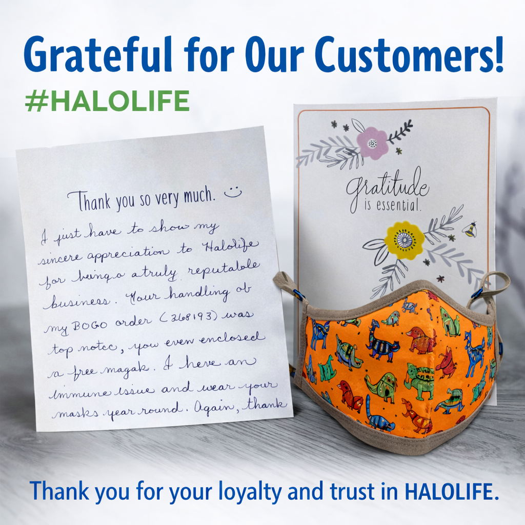 Grateful for Our Customers Your trust inspires everything we do at HALOLIFE.From our breathable white & grey everyday masks, to black mesh performance styles, and our colorful patterned favorites, every HALOmask is designed with one goal in mind—helping you breathe easier and live healthier.We’re honored to support customers who rely on HALOmask year-round for comfort, protection, and peace of mind. Thank you for choosing quality, innovation, and care.